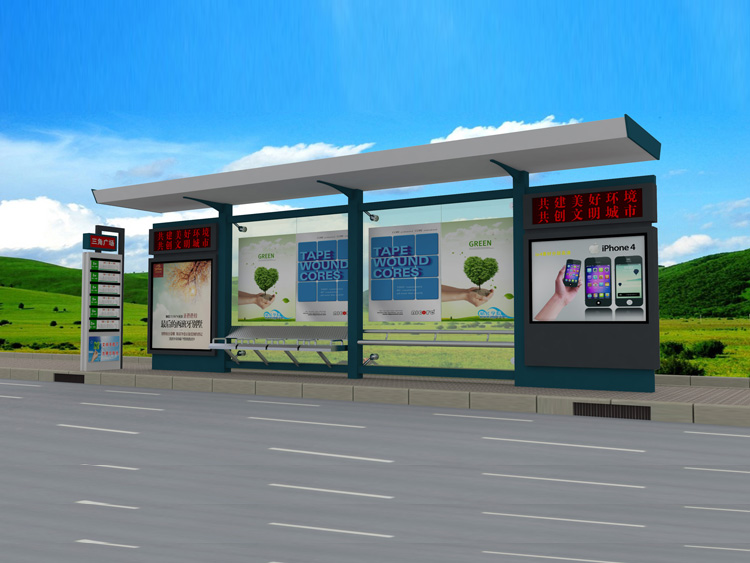 公交車候車亭一般是與公交站牌相配套的,為方便公交乘客候車時遮陽、防雨等,在車站、道路兩旁或綠化帶的港灣式公交?空旧辖ㄔO的交通設施。由于城市公交的日益發達,候車亭已發展成為城市一個不可或缺的重要組成部分,設計精美的候車亭也成為了城市一道美麗的風景。 一般候車亭棚體主要頂棚、立柱、頂弓、廣告燈箱和坐凳組成,也有用隔板來代替廣告燈箱的。