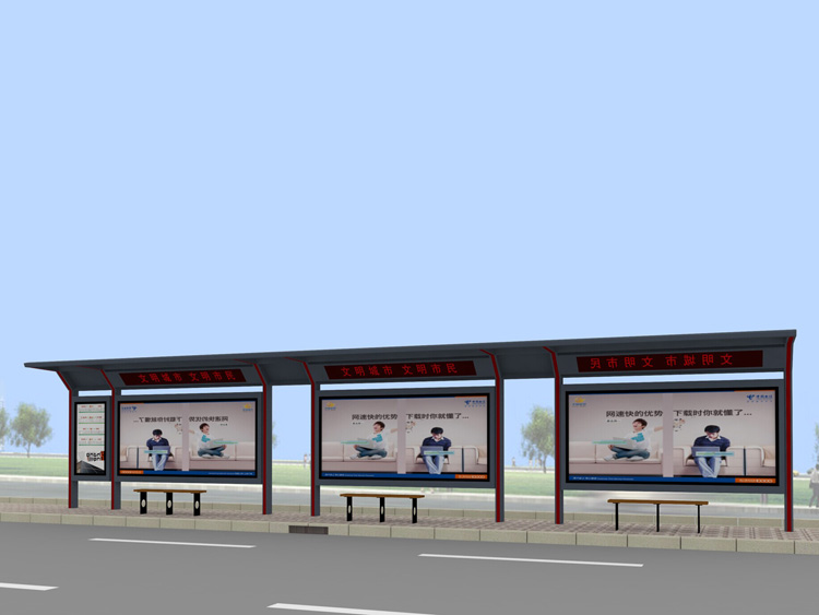 公交車候車亭一般是與公交站牌相配套的,為方便公交乘客候車時遮陽、防雨等,在車站、道路兩旁或綠化帶的港灣式公交停靠站上建設的交通設施。由于城市公交的日益發達,候車亭已發展成為城市一個不可或缺的重要組成部分,設計精美的候車亭也成為了城市一道美麗的風景。 一般候車亭棚體主要頂棚、立柱、頂弓、廣告燈箱和坐凳組成,也有用隔板來代替廣告燈箱的。